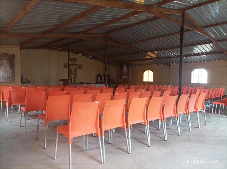 Agradecemos a la empresa Panaservice que nos donó más de 100 sillas naranjas para nuestra capilla.